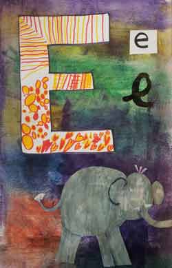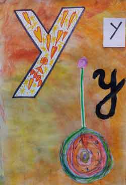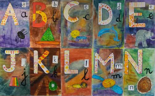 Création Dominique Landau Le fond est fait avec des pastels secs frottés avec la tranche puis estompés et vernis. La lettre est dessinée et découpée par l'adulte et décorée par l'enfant, puis recollée. Les enfants ont fait un dessin aux feutres qui a été découpé et recollé. |