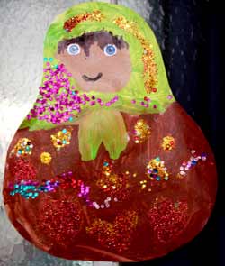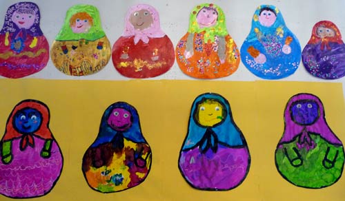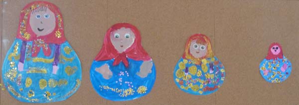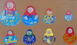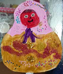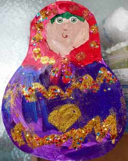 | A l'aide d'un gabarit, faire la forme de la matriochka sur de la cartoline. Les yeux sont des autocollants, le reste du visage est dessiné par les enfants. Elles sont peintes à la peinture acrylique et décorées avec des paillettes. Pour faire un gabarit facilement, pliez une feuille en 2 et ne dessinez que la moitié de la matriochka. Découpez la feuille pliée en 2 et vous obtenez sans effort une symétrie parfaite. Gabarits tout fait, cliquez ici. |