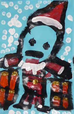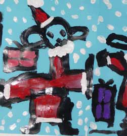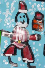 Création Christine Wimmer Les enfants dessinent un Père-Noël à la peinture acrylique, sur papier bleu. Les contours sont noirs et les enfants colorient quand la peinture noire a séché. L'enseignante réalise le panneau collectif. |