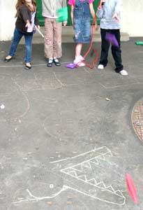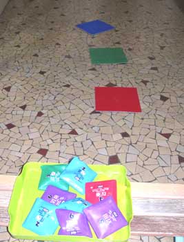 | Chaque enfant se place derrière le banc et lance 2 sacs, si un sac touche le carré rouge, il gagne un point, le vert, 2 points et le bleu 3. | |