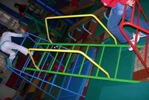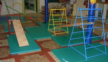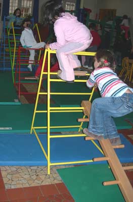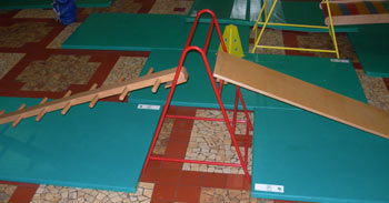 | La poussinière est vraiment utile : elle ne prend pas de place (nous en avons 3 qui s'emboitent les unes dans les autres pour le rangement). Elles permettent de créer des obstacles intéressants lors d'ateliers ou de parcours. C'est bien d'en avoir au moins 2 de taille différente, avec de petits accéssoires (échelle, planche (comme ci_contre), pour varier les façons de monter et de descendre. on peut rendre l'exercice plus difficile en demandant de mettre un anneau sur la tête.