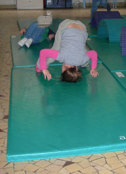 Cette activité nécessite de bien échauffer le cou. Au bout de quelques séances, tous les enfants y parviennent, si on explique bien le principe et que l'on est présent à cet atelier quand les enfants ne maîtrisent pas encore. Ils sont ensuite autonomes et aiment beaucoup. Ci-dessous, piste de roulade |